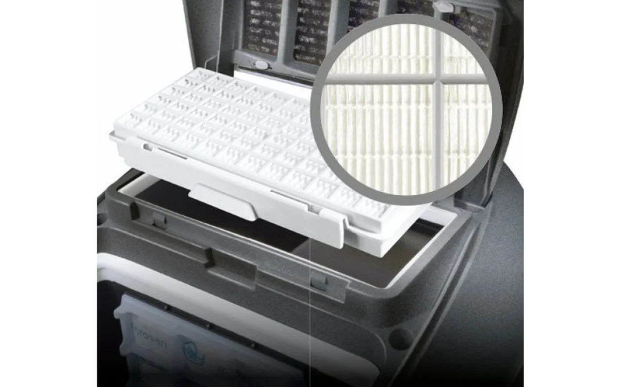 در قسمت خروجی هوای دستگاه فیلتر HEPA ، برای جلوگیری از ورود گرد و غبار به محیط تعبیه شده است. توسط سیستم Quattro Power نهایت تمیزی با کمترین مصرف انرژی اعمال میشود . توسط سیستم Power Protect نیز، حتی در هنگام پر بودن کیسه ، دستگاه نهایت کارایی و مکش را دارد.