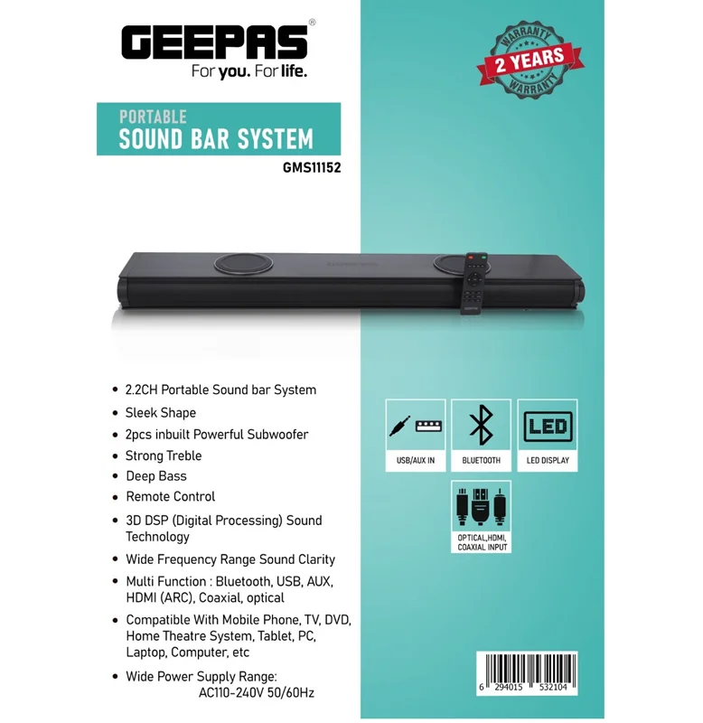 ساندبار جیپاس مدل  GMS11152 کوچک و براق دارای قدرت خروجی بالا است و می تواند با تلویزیون ، لپ تاپ ، کامپیوتر ، موبایل و غیره جفت شود. - کیفیت صدای بالا ، ساخت اتاق خواب و فضاهای جمع و جور پر از جلوه های استریو گسترده. اتصال چندگانه - نوار صدا از 35 میلی متر (AUX & RCA) و ورودی صدای سیم دار نوری برای استفاده در تلفن های همراه ، رایانه لوحی ، تلویزیون ، رایانه ، پروژکتور ، ست باکس و غیره پشتیبانی می کند. لطفاً برای تنظیم ورودی ARC/نوری از تنظیمات صوتی تلویزیون خود بر روی PCM اطمینان حاصل کنید. قبل از استفاده پس از اتصال اسپیکر به لپ تاپ یا تلفن همراه ، روی مبل راحتی بنشینید و از موسیقی با کیفیت بالا لذت ببرید.با این نوار صوتی قابل حمل Geepas ، کیفیت صدای خود را به طرز هوشمندانه ای ارتقا دهید زیرا دارای فناوری تقویت صدا است که جلوه های صوتی واضح و با کیفیتی را برای لذت بردن از موسیقی ، فیلم های مورد علاقه شما و یا هنگام بازی انجام می دهد. به تلویزیون ، تلفن همراه ، لپ تاپ و سایر دستگاه های سازگار با بلوتوث. کنترل از راه دور شدت صدای سه تایی و باس را تنظیم می کند ، حالت موسیقی یا فیلم مورد نیاز خود را تغییر می دهد ، صحنه های مختلف خود را ملاقات می کند ، خانه شما را به طور جادویی به سینمای خصوصی شما تبدیل می کند ، خانه اپرا ، سالن بازی نوار صوت را باز کنید ، ساب ووفر را وصل کنید از اوقات فراغت گرانبهای خود لذت ببرید صفحه LED به راحتی عملکرد فعلی را نشان می دهد. آیا به دنبال Soundbar پیشرفته با ساب ووفر قدرتمند برای تلویزیون هستید اما اندازه جمع و جور؟ با طراحی باریک و شیک ، Soundbar Geepas می تواند به راحتی در هر خانه ای قرار گیرد ، بدون نگرانی در مورد اشغال فضای زیاد یا مسدود کردن دید. با وجود اندازه کوچک ، صدا همچنان چشمگیر است. سیستم صوتی 2.2 کانالی صداهای فراگیر و متعادل تولید می کند ، چه هنگام شنیدن موسیقی و چه هنگام تماشای فیلم یا بازی کردن. نوار صوتی علاوه بر خیره کننده هر تلویزیون و کنسول بازی با طراحی زیبا و مدرن که کاملاً با تلویزیون شما مطابقت دارد ، روی دیوار نصب شده یا روی پایه نمایش داده می شود. دارای ورودی های کابل و طیف گسترده ای از گزینه های اتصال مانند (HDMI ARC ، Optical ، Bluetooth ، USB ، AUX) ، نوار صوتی برای بسیاری از برنامه ها مناسب است. می توان آن را به راحتی به تلویزیون متصل کرد تا یک تجربه کیفیت صدا مانند تئاتر ایجاد کند. هنگام تماشای نمایش ها و فیلم های مورد علاقه خود ، بدون ایجاد زحمت برای راه اندازی یک سیستم بلندگوی پیچیده ، از صدای فراگیر لذت ببرید. تجربه سرگرمی خود را از طریق این نوار صوتی Geepas برای تلویزیون ، لپ تاپ ، تلفن همراه ، رایانه لوحی ، رایانه افزایش دهید. بنابراین هنگام پخش بازی یا گوش دادن به موسیقی ، تجربه صدای قابل اعتمادتر و پویاتر داشته باشید.