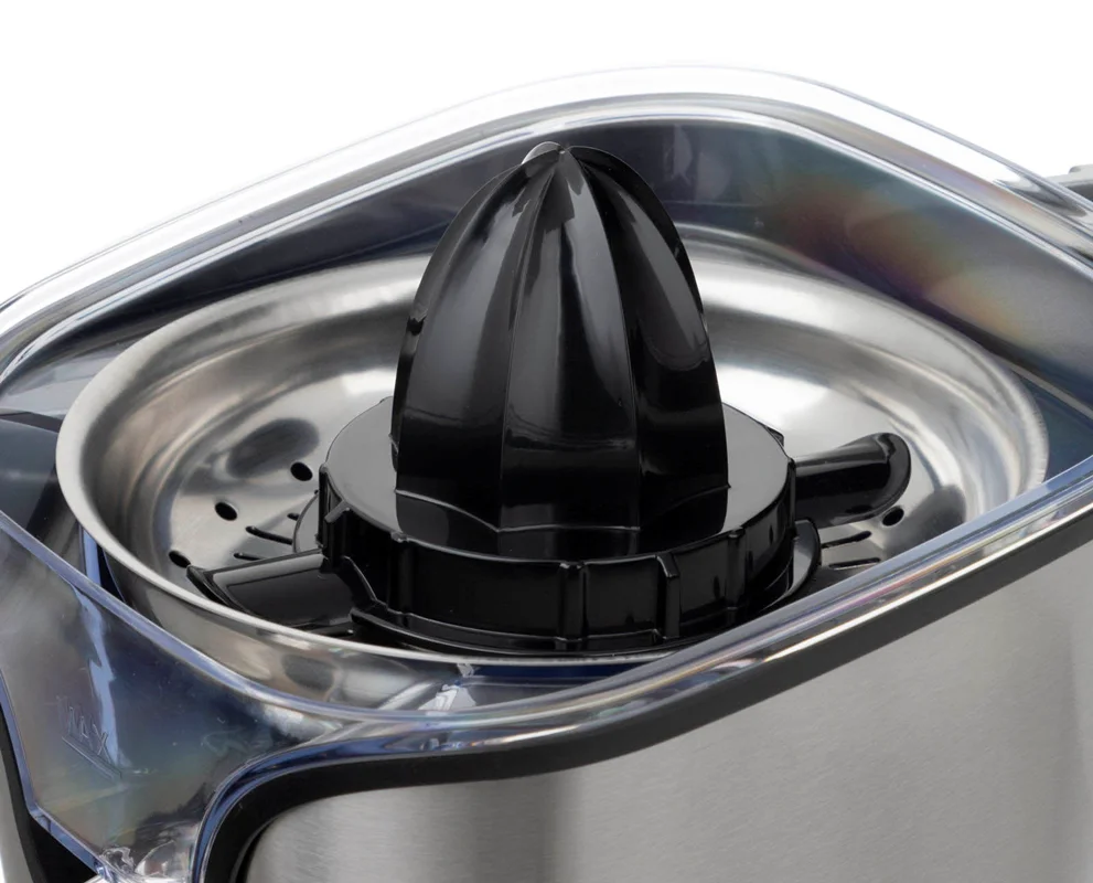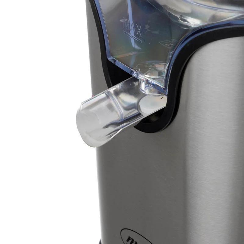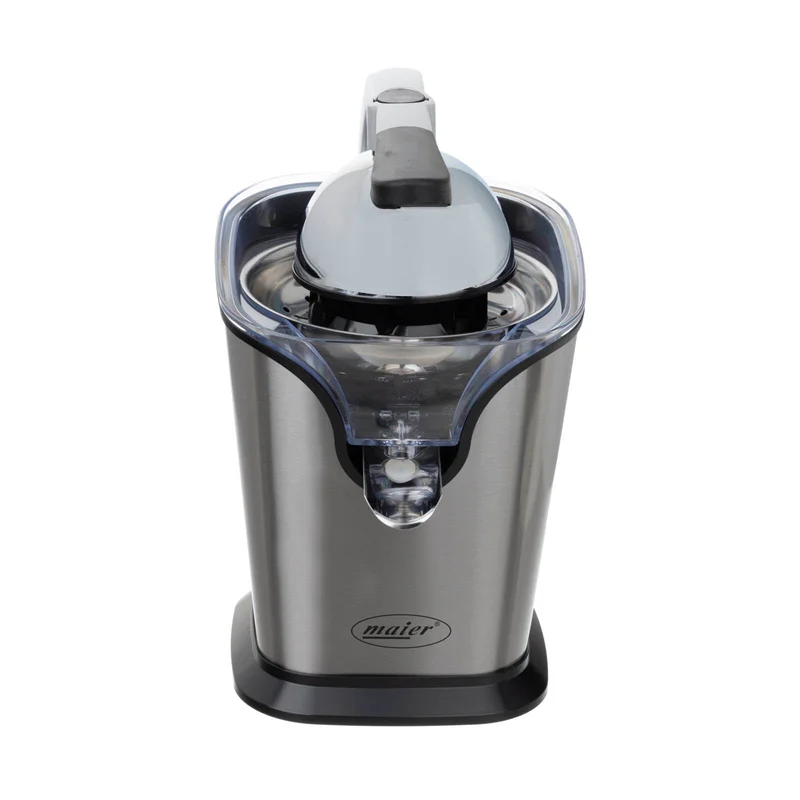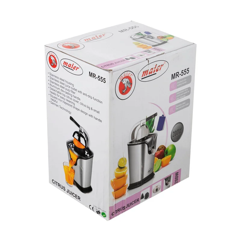 آب مرکبات گیری مایر مدل MR-555 از جنس استیل و با طراحی زیبایی ساخته شده است. برای قسمت فوقانی دستگاه یک دسته پر قدرت از جنس آلومینیوم به صورت اهرم برای فشار دادن بهتر میوه قرار گرفته است که از نظر جنسیت و استحکام نیز از کیفیت مناسبی برخوردار است. مهم نیست شما قصد آب گیری یک لیموترش کوچک یا یک پرتقال بزرگ را دارید آب مرکباتگیری مایر مدل MR-555 با برخورداری از دو سری با سایزهای متفاوت برای عصارهگیری از مرکبات بزرگ و کوچک مناسب است و هم چنین طراحی تیغه مخروطی و توری آبگیری، و همچنین اهرم فشاری به شما اجازه میدهد آب هرگونه مرکبات را با بهترین کیفیت بگیرید. یکی از نکات مهمی که در هنگام خرید آب مرکبات گیری باید به آن توجه نمود وجود فیلتراز جنس استیل ضد زنگ در این دستگاه ها می باشد، زیرا اغلب میوه هایی که با این دستگاه آبگیری می شوند، دارای خاصیت اسیدی می باشند و در صورتی که فیلتر استیل و ضدزنگ نباشد، پس از مدتی کوتاه در اثر تماس با آب میوه ها، فیلتر دچار خوردگی و زنگ زدگی می شود.جنس تیغه مخروطی و همچنین صافی آبگیری نیز از استیل ضدزنگ است که با طراحی مورب قسمت فوقانی و وجود اهرم فشار عملکرد مناسبی را خواهد داشت. از دیگر ویژگیهای این محصول موتور کمصدا و همچنین قطعاتی است که به آسانی در ماشین ظرفشویی قابل شستشو میباشند. دسته اهرم برای راحتی مصرفکننده به صورت ارگونومیک طراحی شده است.
