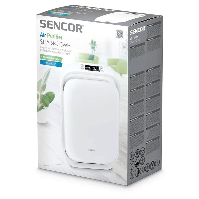 دستگاه تصفیه هوای سنکور مدل 9400, بالاترین مدل تصفیه هوای سنکور تا این لحظه است. این مدل هوا را در 8 مرحله تصفیه میکند و ریز گردها، باکتری و ویروس ها، بوی نامطبوع و عوامل آلرژی زا را از هوای محیط حذف میکند. حجم هوایی که تصفیه هوای 9400 تصفیه میکند برابر است با 483 متر مکعب در ساعت که مقدار قابلی است. همچنین از آن میتوانید برای محیط هایی که تا 50 متر مربع مساحت دارند استفاده کنید.