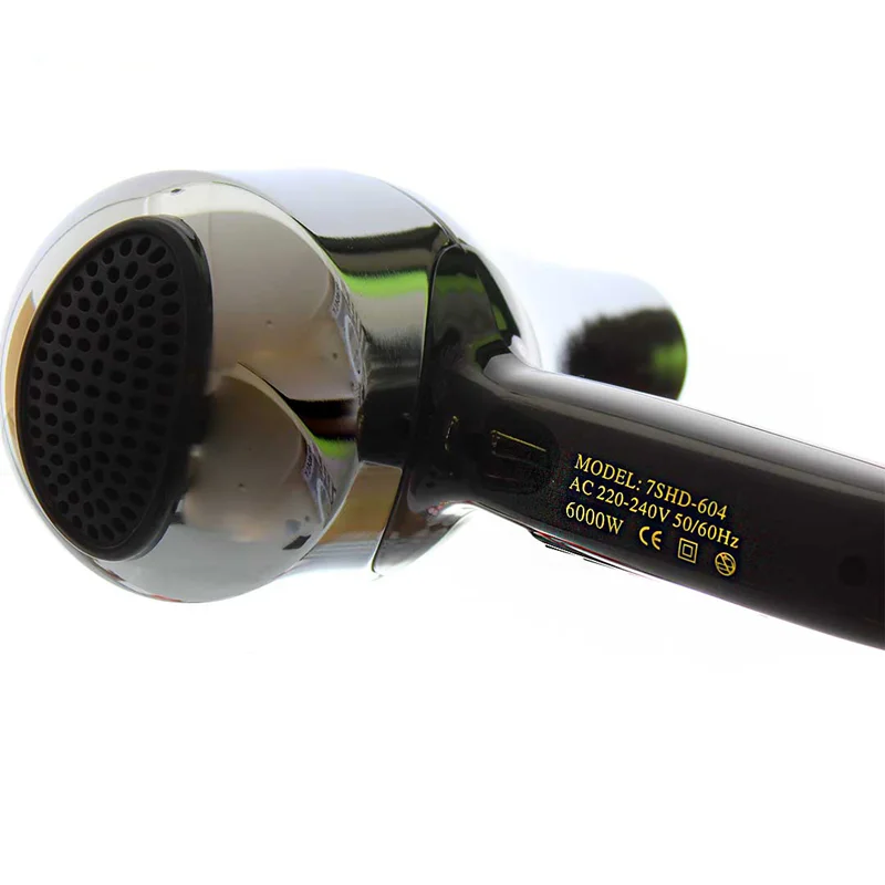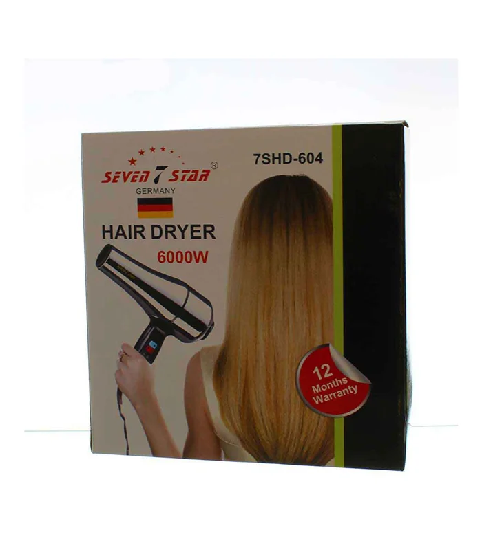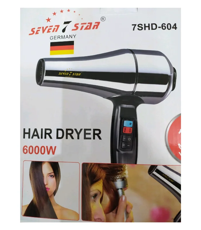 سشوار حرفه ای و تمام استیل سون استار مدل 7SHD-604 مورد تایید استاندارد اروپا (CE) ، یکی از سشوارهای با کیفیت این شرکت محسوب می شود که باموتور پرقدرت AC و توان 6000W وات قادر است موها را به سهولت خشک کند و حالت دهد. همچنین این دستگاه دارای 2 سرعت و 3 حالت دمای قابل تنظیم (خنک ، ملایم و گرم) می باشد که برروی دسته سشوار به طور جداگانه توسط 2 دکمه بسیار مقاوم تعبیه شده اند بنابراین به سهولت می توان با توجه به مدل مو از انها استفاده کرد.