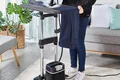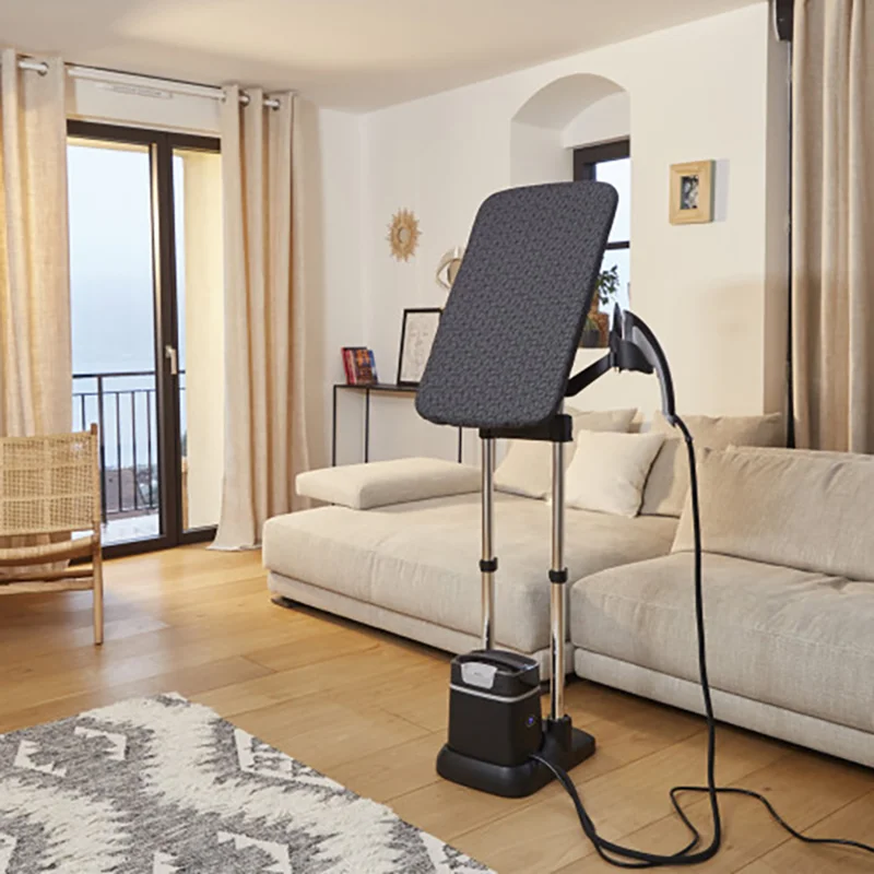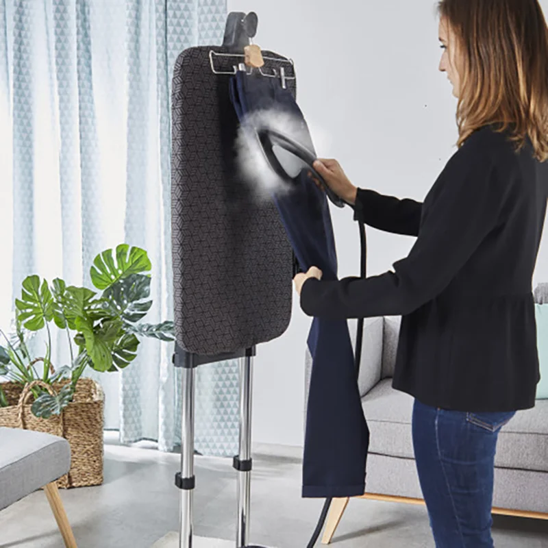 بخارگر تفال مدل QT1510 دستگاهی پرقدرت، با امکانات کاربردی و سطح کیفیت بالا، جهت اتو کشیدن انواع لباس در حالت ایستاده میباشد. این دستگاه با موتور قدرتمند 2400 واتی سیستم بخاردهی هوشمند و بهینهای دارد که متناسب با انواع لباسها پخش بخار را صورت داده تا در عین رضایت کامل از رفع چین و چروک، باعث ایجاد خط اتو نیز شود. امکانات کاربردی دستگاه شامل یک تکیه گاه مستحکم جهت آویزان کردن لباس در حالت ایستاده و یا تغییر حالت به شکل میز اتو است. البته این تکیه گاه قابلیت تنظیم ارتفاع و زاویه را نیز دارد و همانطور که مشاهده میکنید تا تغییر زاویه 90 درجهای، میتوان به حالت میز اتو، از آن استفاده کرد.